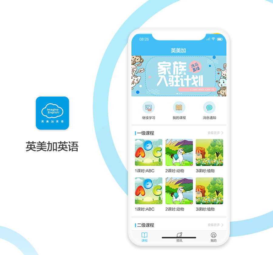 英美加是一款在线学习英语的平台,可以查看自己的课程,课程级别,学习进度,查看英语相关资讯以及活动通知等!