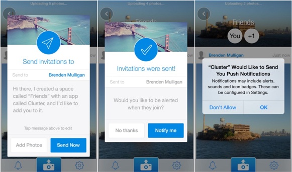 而在要求推送通知之前,Cluster问了一个合情合理的问题:“是否希望在朋友加入时通知你?”这样处理的结果与通讯录权限类似,选择了“通知我”的用户都允许了Cluster推送通知。