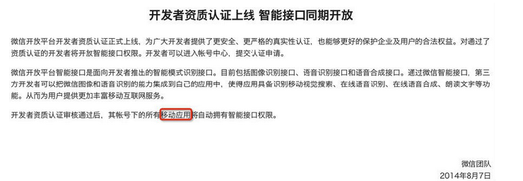 微信开放平台(不是微信公众平台)昨天宣布上线开发者认证功能,与此同时开放的还有智能接口,具体内容如下: