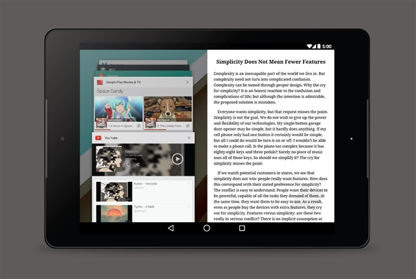 须注意的是,谷歌的试验是在一个4:3平板上进行的,但最终会支持任何比例的屏幕,但都需要水平方向才行。另外,鉴于谷歌的多任务功能仍然是非常初期的,效果并不是太好,因此在Android L上实现的希望不是很大。